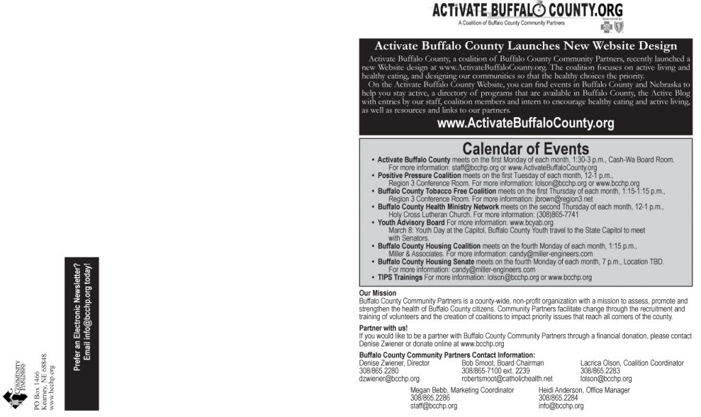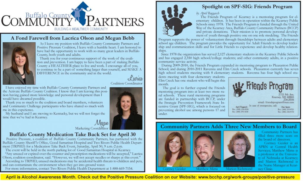 The April Newsletter for Buffalo County Community Partners is now available. To view the newsletter, click on an image below or April 2011 Newsletter.