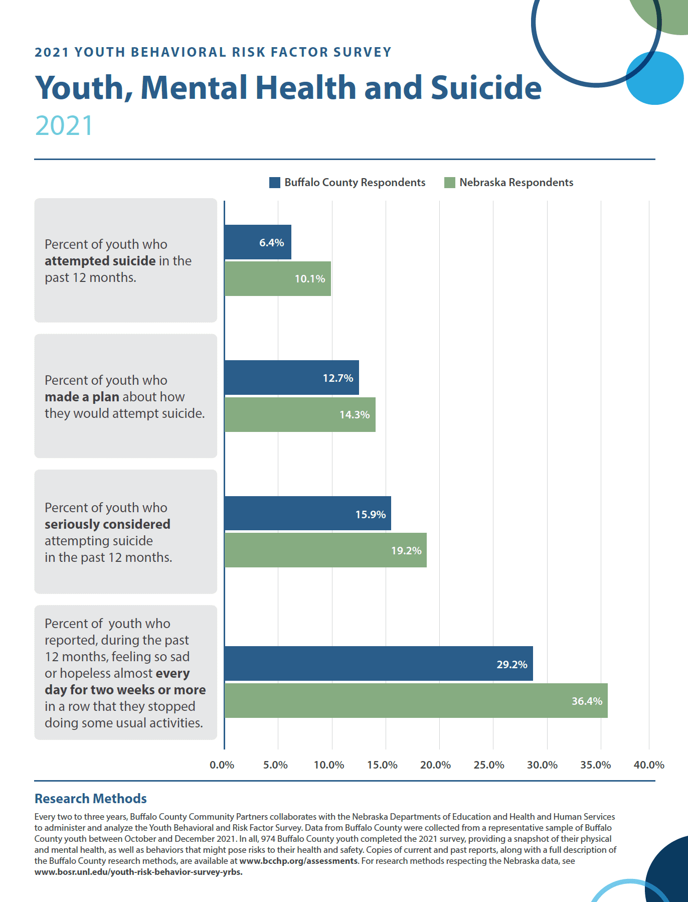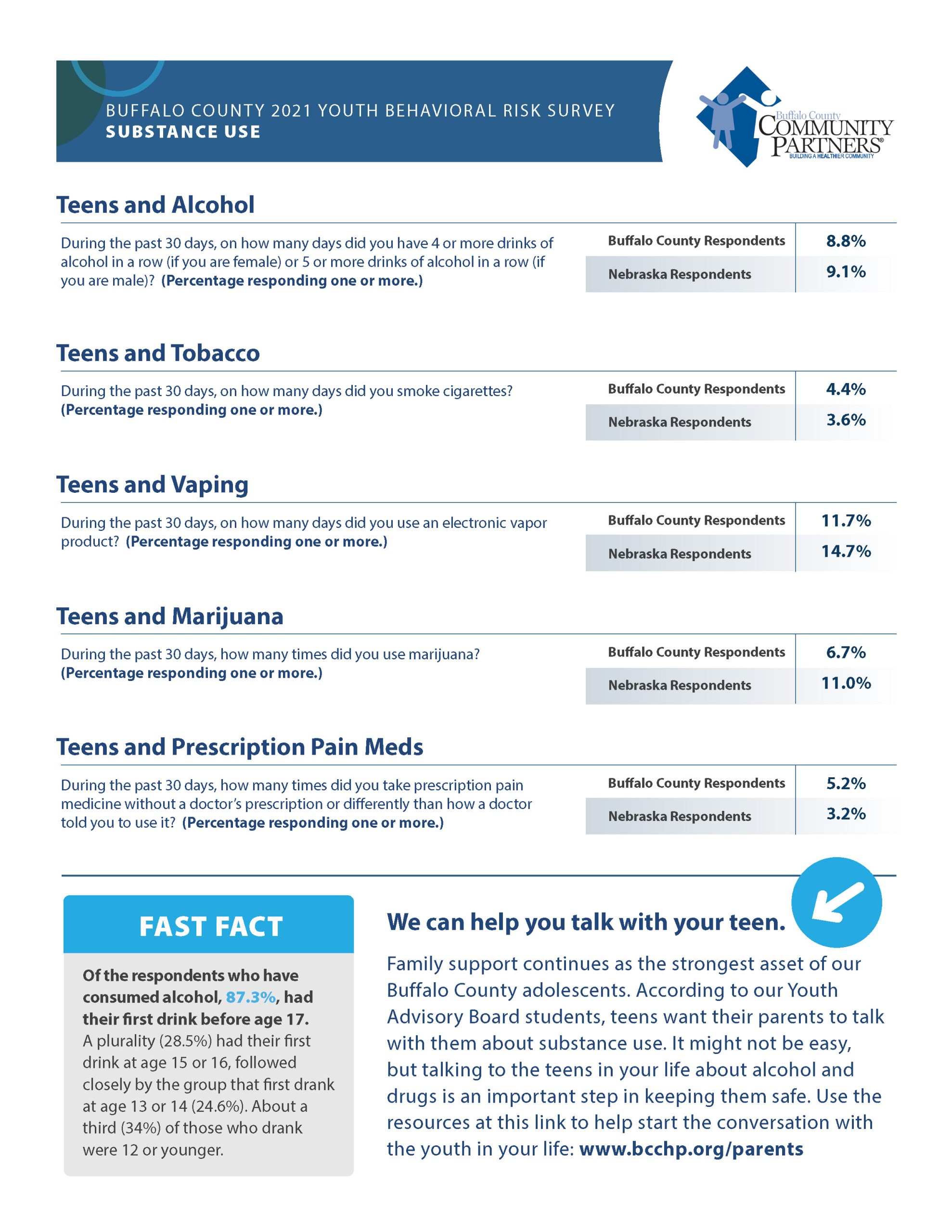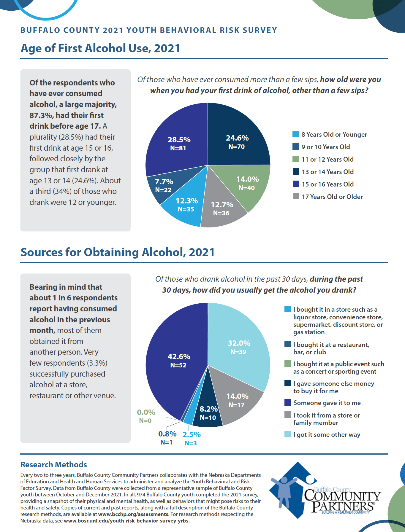 Buffalo County Community Partners has done an oversample for both the YRBS and the NRPFSS since 2000 to better understand issues facing youth in the county. Traditionally, the surveys are conducted in nine middle and high schools in Buffalo County, Nebraska every two years. A Developmental Assets Profile is also conducted on at that time. Developmental Assets have been extensively researched and have shown that the more assets youth possess the less likely they are to engage in high-risk behavior.