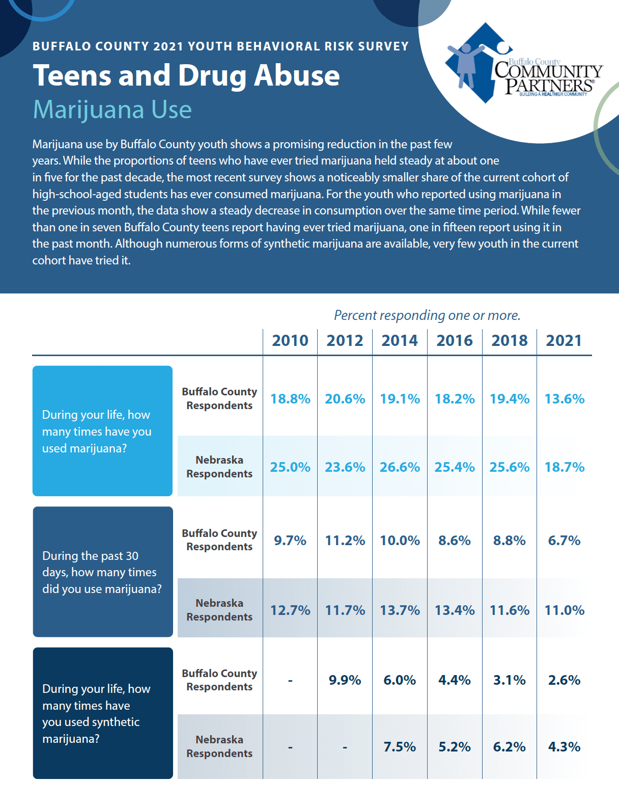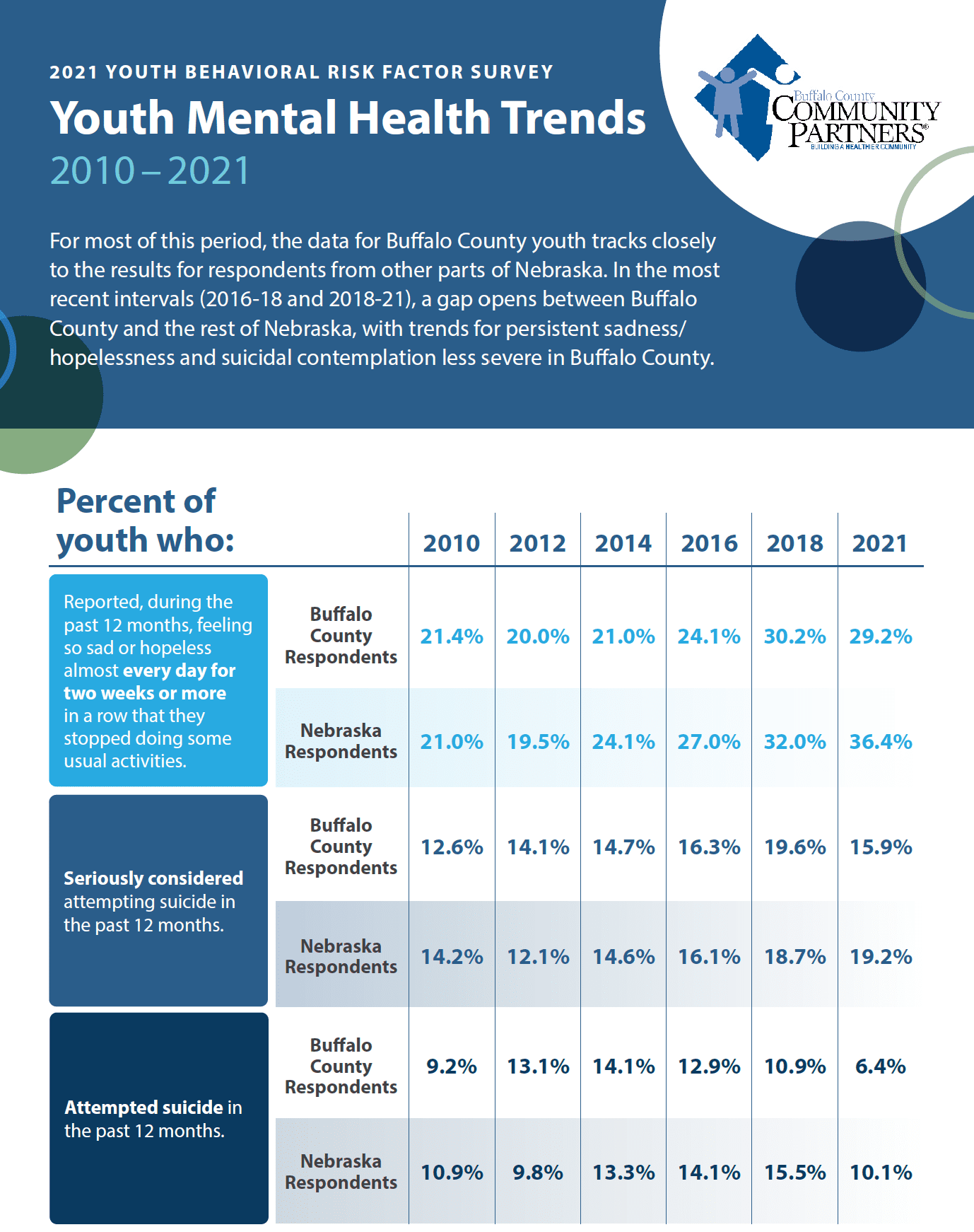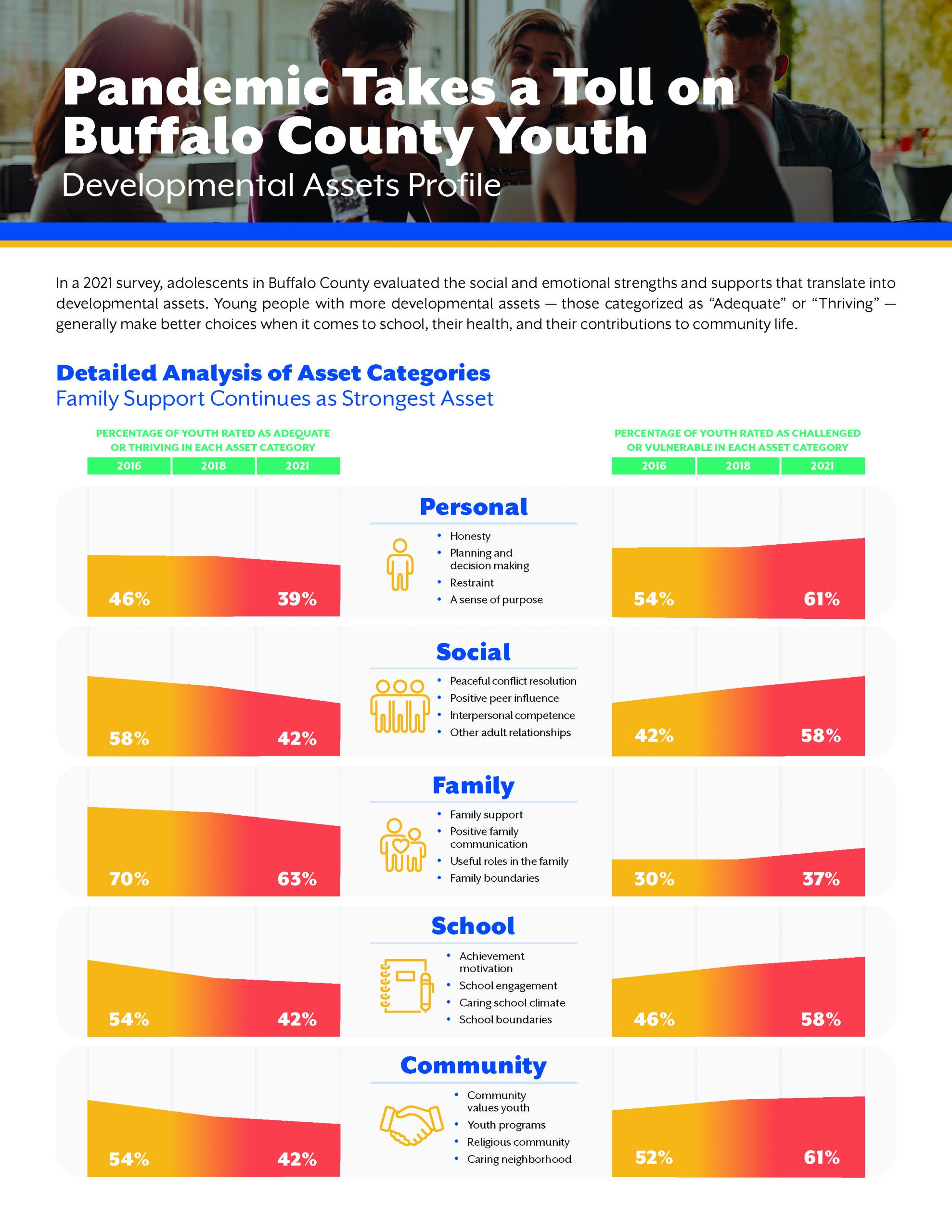 Buffalo County Community Partners has done an oversample for both the YRBS and the NRPFSS since 2000 to better understand issues facing youth in the county. Traditionally, the surveys are conducted in nine middle and high schools in Buffalo County, Nebraska every two years. A Developmental Assets Profile is also conducted on at that time. Developmental Assets have been extensively researched and have shown that the more assets youth possess the less likely they are to engage in high-risk behavior.