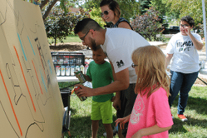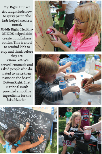 Impact Art, a new community nonprofit, came and taught kids how to spray paint. The kids sprayed onto a big mural that the artist tuned into the word Refresh at the end. Other activities included a bounce house, the bike blender, kids yoga, various yard games, kayaks, and the lemonade stand. The Youth Advisory Board students ran the lemonade stand to raise awareness of our summer campaign to “Refresh Your Community.”