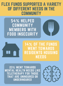 The flex funds supported a variety of different needs in the community. 14% of the funds went towards residents housing needs, 54% helped community members with food insecurity, and 23% went towards mental health needs like teletherapy for those that are uninsured or underinsured.