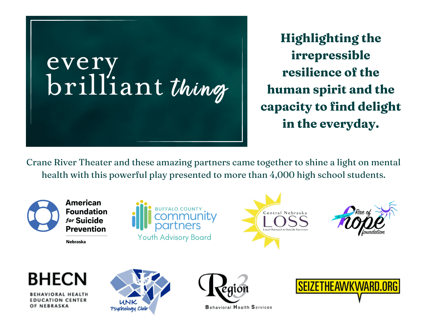 Crane River Theater is excited to announce the premiere of “Every Brilliant Thing” written by Duncan Macmillan with Jonny Donahoe as a part of its twelfth production season. “Every Brilliant Thing” tells the inspiring story of a young kid who creates a list of all the things that makes life worth living for his mother so she doesn’t try to leave the world again. “Every Brilliant Thing” showtime starts at 7 pm from June 3-5 and 2 pm on June 6 located at The Village in Kearney. For more information: https://cranerivertheater.org/every-brilliant-thing/