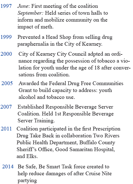 During the early years, the coalition specifically worked with community members and policy makers to prevent a head shop from selling drug paraphernalia in 1999. Under collaborative efforts primarily between the former Family Resource Council, Buffalo County Community Partners and Region 3