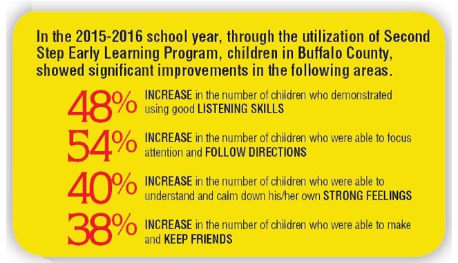 The Buffalo County Schools early learning classrooms through first grade and Buffalo County childcare providers have been implementing the Second Step curriculum since the fall 2015. See the box of results below of how Buffalo County students benefited from the Second Step curriculum last year.