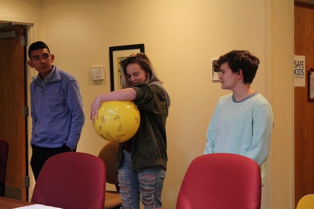 From left to right: Jose Montanez, Shelton; Brooke Anderson, Kearney; and Matt Smiley, Kearney all introduced themselves with the “ice breaker” ball. These three students were all applying for a position on the YAB board.